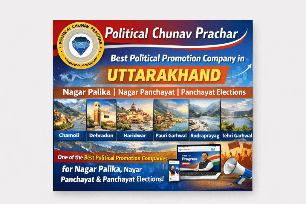 Political Chunav Prachar is one of the best and most trusted political promotion companies in Uttarakhand, delivering result-oriented digital and ground-supported election campaigns. We specialize in Nagar Palika, Nagar Panchayat, and Panchayat elections, helping candidates connect with voters through strategic digital outreach, local branding, and ethical political marketing.